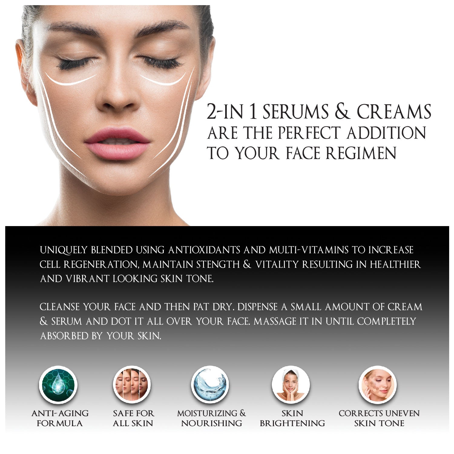 HOW TO USE: Cleanse your face, than pat dry. Dispense a small amount of cream + serum then dot it all over your face. Massage it all over your face until completely absorbed by your skin. Use twice a day, or as often as you desire.