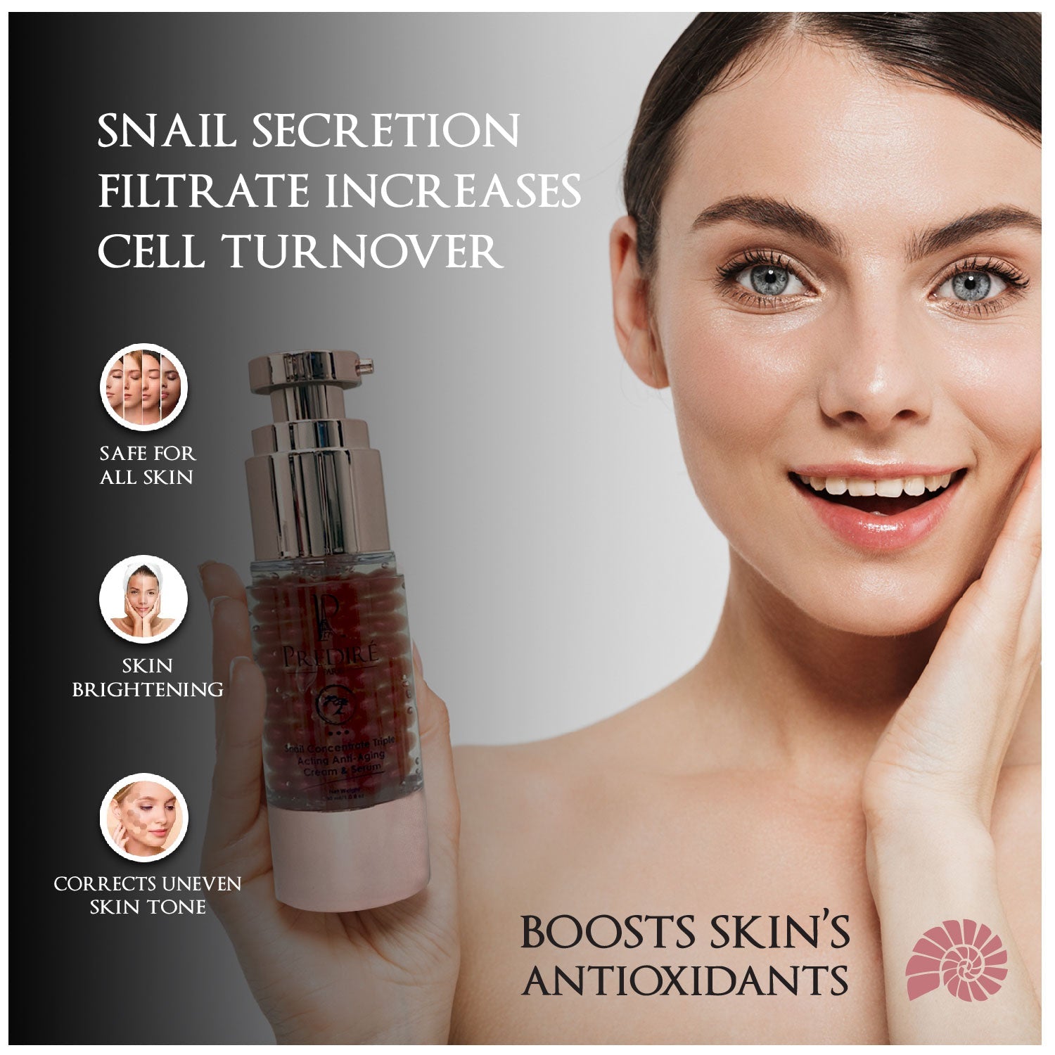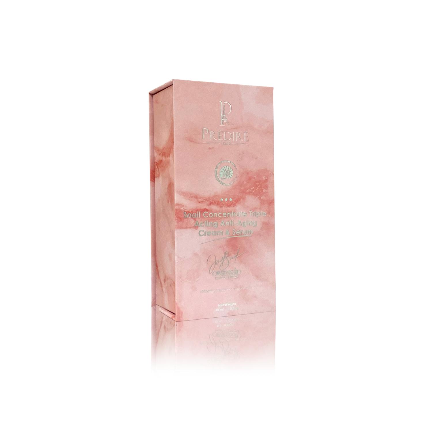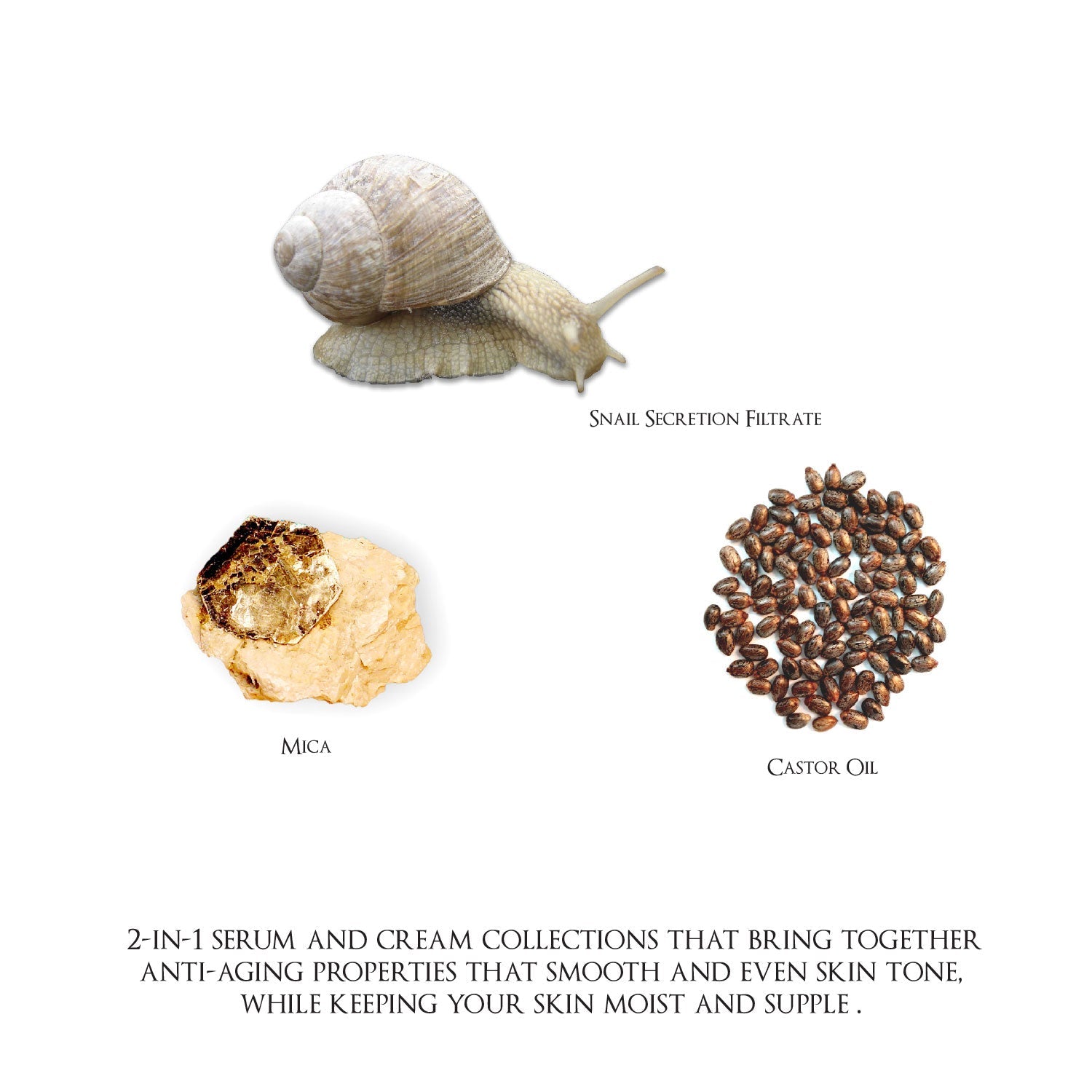 Our 2-in-1 cream and serum is rich in Snail Secretion Filtrate, which encourages the oxygenation of skin cells, that aids in the regeneration of damaged tissues. Furthermore, snail filtrate includes glycolic acid, a natural exfoliator that aids in the removal of dead skin cells and promotes cell regeneration. This reduces the appearance of scars as well as fine lines and wrinkles. Snail filtrate includes hyaluronic acid, glycoprotein, proteoglycans, antibacterial and copper peptides, and other anti-aging ingredients. These nutrients aid in the protection of the skin against infection, dryness, and UV radiation. Snail filtrate has high levels of vitamins A and E, which are beneficial to your skin. Get your dream skin with our Snail Concentrate Triple Acting Anti-Aging Cream & Serum!